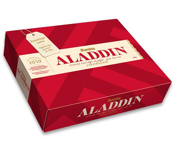 Vad vore julen utan Aladdin? Svenska folkets mest älskade pralinask kommer med både julglädje och gemenskap - och den oskrivna regeln att aldrig börja på det undre lagret, förrän det övre är slut. Aladdin är en klassiker och funnits i Marabous sortiment sedan 1939.
